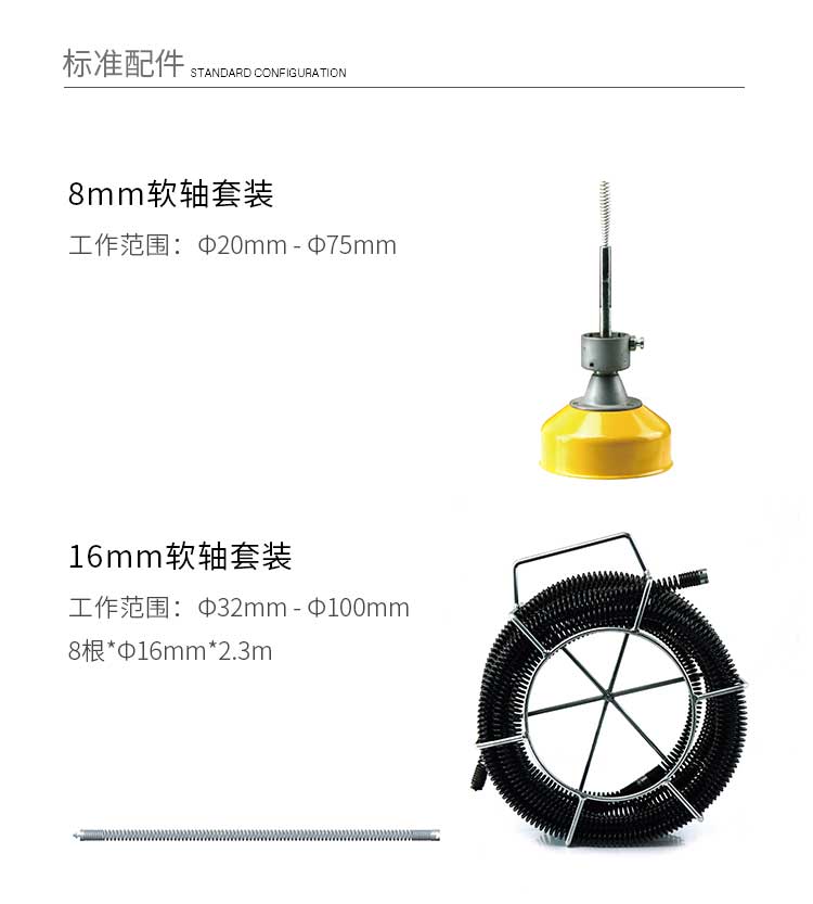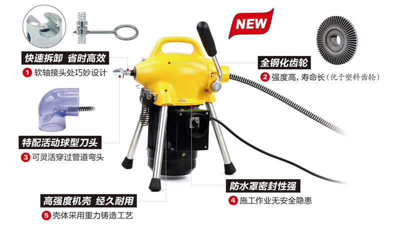 A75G疏通機采用壓力摩擦離合器三瓣結構,可以輕松地使機器處于工作和待機兩種狀態,安全可靠,結構簡單輕巧,移動方便,可以使用8mm軟軸、l6mm軟軸,對于疏通清洗槽盆、衛生間、樓宇等管道堵塞的首選設備。