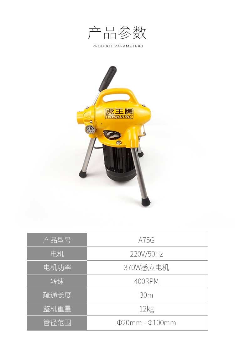 • 產品描述:虎王A75G高效管道疏通機大功率下水道快速疏通機神器電動管道疏通機